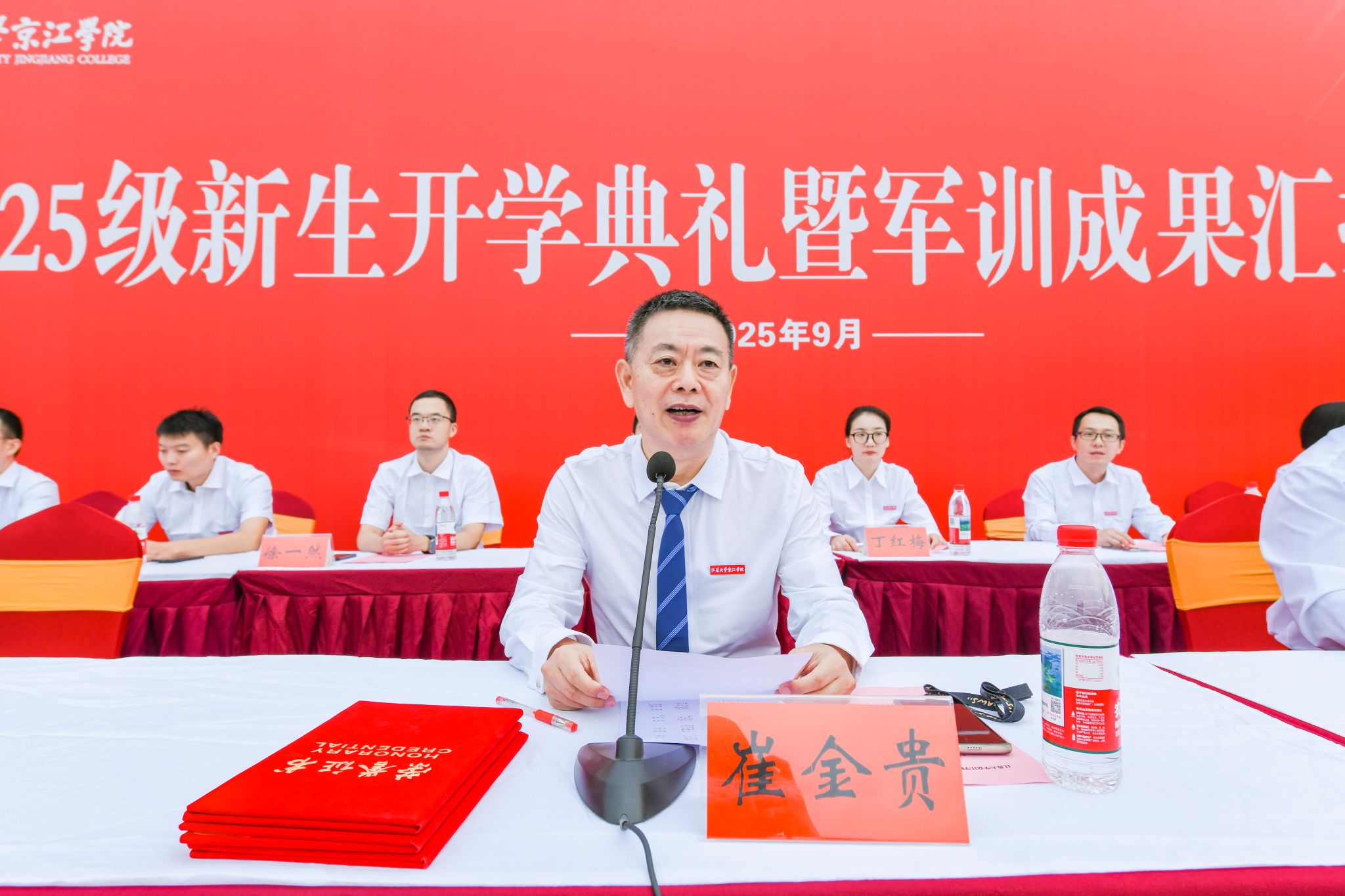 中国人民解放军32521部队中校副团长吕大楼、润州区人武部部长顾海华、开云足球教程全体院领导、各二级单位负责人、新生辅导员、全体2025级新生参加了开学典礼。典礼由京江学院党委副书记、纪委书记蒋豪主持。