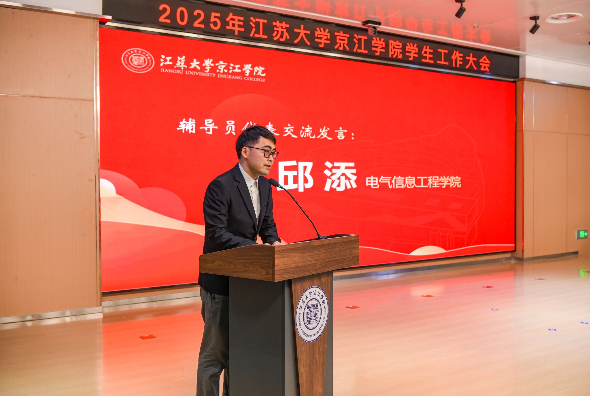 在交流发言环节,辅导员代表邱添结合自身工作实践,分享了在学生教育、管理与服务过程中的心得体会。学生代表许靖晗则从学生视角出发,畅谈个人成长收获与未来展望,展现了京江学子积极向上的精神风貌。