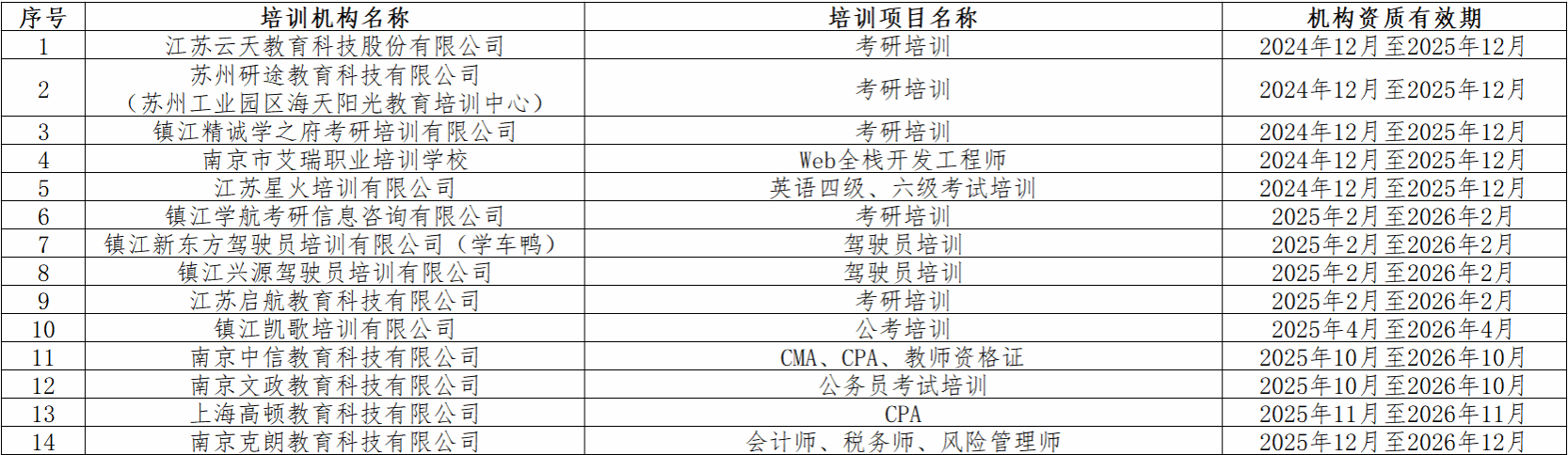 为加强对培训机构的规范管理,保障学校正常的教学、生活秩序,维护学生的合法权益,学生工作部对符合相关规定的培训机构及项目进行资格审核,现将2025年符合相关规定的培训机构及培训项目名单公布如下: